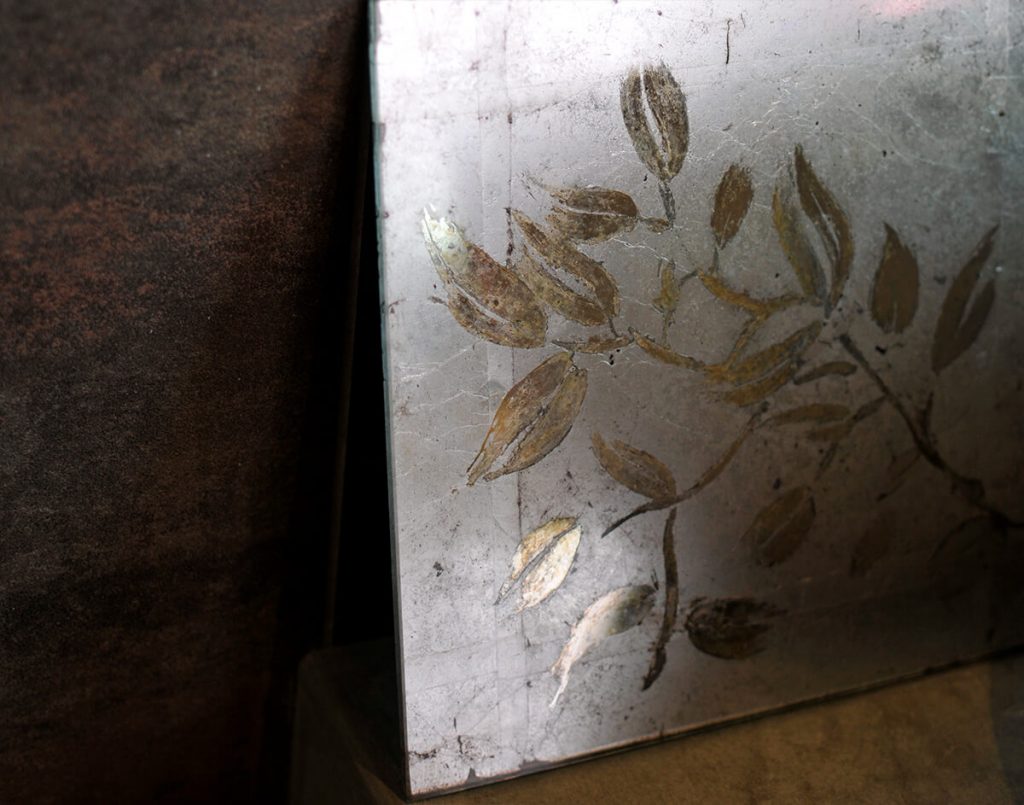 Foglia alluminio ossidata e motivi decorativi di foglie in specchio anticato